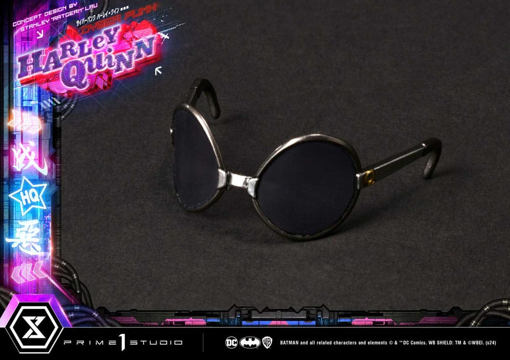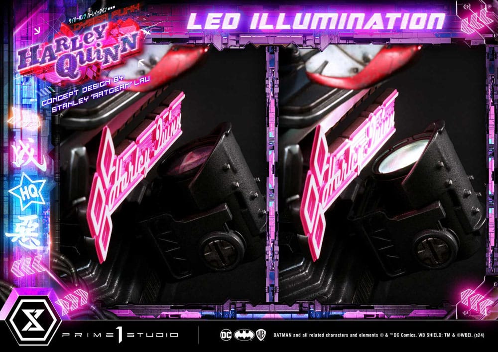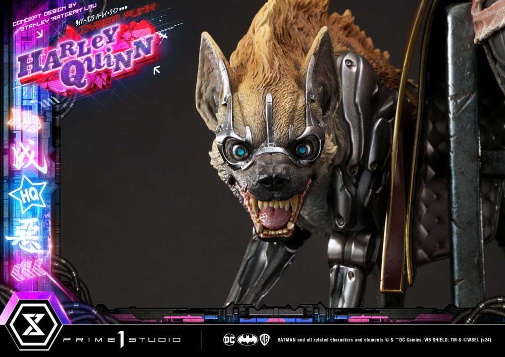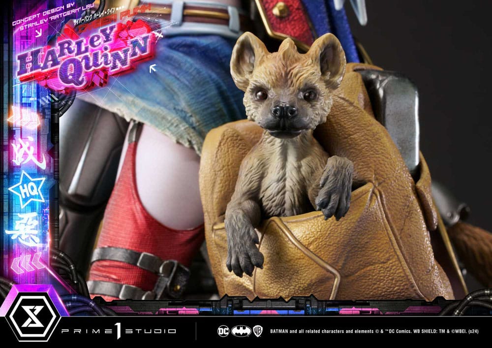 "Mama's gonna paint the streets with blood" Prime 1 Studio is proud to present yet another breathtaking addition to our Ultimate Museum Masterline Series, in collaboration with Stanley "Artgerm" Lau, here is the 1:4 Scale UPMDC-08 Cyberpunk Harley Quinn from DC Comics! This time around, Prime 1 Studio takes you far into the future, to a dystopian Gotham City. The already dark and corrupt Gotham reaches new societal lows as technological advancements reach new highs. The one and only Artgerm has once again come up with a masterful reimagination of our beloved Harley Quinn and the artists at Prime 1 Studio have done an outstanding job at bringing Stanley Lau's concept to life. Standing over 24 inches tall, this new and improved Harley has been redesigned from head to toe. Her edgy yet playful demeanor is captured in her striking stance, her weapon wedged snugly between her elbows and back as she makes the horn gesture with both hands, exuding a subtle blend of ease but also confidence. Pretty much like every other denizen of Cyberpunk Gotham, she is augmented with cybernetics, technological modifications applied to the human body for improved physical and mental capabilities, blurring the lines between man and machine. Her right-side appendages have been enhanced and completely swapped by cyborg prosthetics. Her attire has also been redesigned to fit her avant-garde futuristic fashion style, while still retaining her signature duality of red and blue. Her initials are featured on the back of her coat. As usual, she is accompanied by her loyal hyenas Bud and Lou, as you can see, cybernetic enhancements aren't only reserved for humans. They all stand atop a cyberpunk-city-themed base that features LED illumination, it wouldn't truly be cyberpunk without the neon lights, now, would it? You can display Harley in a softer and poised facial expression or a more rock-edgy tongue-out with the two included head parts, we've also thrown in a pair of sunglasses as well as a head base. The Maid of Mischief means business in this cyberpunk Gotham of the future, so be sure not to miss out on this awe-striking redesign by Stanley "Artgerm" Lau and place your pre-order of the UPMDC-08 Cyberpunk Harley Quinn today! Product Specifications:- Statue Size approximately 23.6 inches tall [H:60cm W:36cm D:35cm] - Cyberpunk-themed base - LED illuminations on base - Two (2) Swappable head parts (Normal and Tongue) - One (1) Swappable back logo - One (1) pair of sunglasses - One (1) headstands