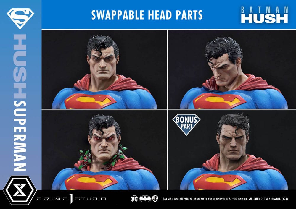 "Hush" Edition Man of Steel: Heroic Glory Reimagined in 1/4 Scale. Prime 1 Studio is thrilled to reintroduce the legendary 'Man of Steel' from the early 2000s DC Comics masterpiece, "Batman: Hush." Created by the iconic duo Jeph Loeb and Jim Lee, this Superman figure joins the Ultimate Premium Masterline collection in a stunning 1/4 scale. Originally released in 2018 as a highly sought-after 1/3 scale statue, this edition has been resized to a more display-friendly 1/4 scale while preserving the exceptional artistry that captures Jim Lee's unique style. Superman's signature deep crimson cape billows impressively as he poses mid-flight, evoking the dynamic imagery from the comics. The connection between the statue and the specially designed base creates a striking floating effect. The statue boasts the distinctive musculature illustrated by the renowned comic book artist, with prominent deltoids, a proud chest bearing the iconic S-shield, and powerful quadriceps. The comic-style shading enhances the physique, truly bringing to life the steel-like appearance that defines Superman's moniker. This version includes three interchangeable heads with different expressions: one looking straight ahead, one looking downward, and another where Superman is mind-controlled by Poison Ivy. It's up to you, the director, to decide which scene you want to recreate. And for the Bonus Edition, limited to only 500 pieces worldwide, we have included a head part inspired by another masterpiece by Jim Lee, "Superman: For Tomorrow." The expression, filled with sorrow, perfectly captures the essence of a troubled hero. This addition brings the weighty themes of the work to your display. The Man of Steel from "Batman: Hush" returns once more, condensed into a highly displayable 1/4 scale figure. Enjoy the heroic charm that has been finely crafted for collectors everywhere. Product Specifications: - 3 x Portraits (Normal, Looking Down, Mind Controlled) - 2 x Head Stands - 1 x Designed Base - 1 x Head Part (Tribute to "Superman: For Tomorrow") [BONUS PART] - 1 x Head Stand[BONUS PART]