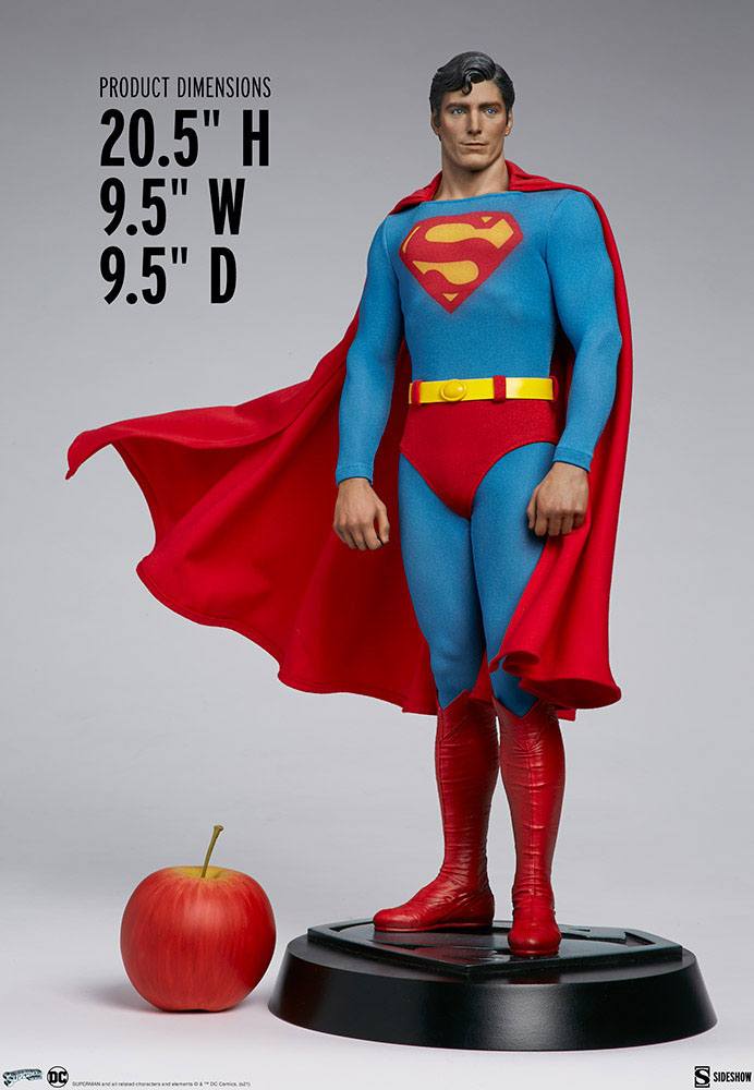 "I'm here to fight for truth and justice and the American way."Sideshow presents the Superman: The Movie Premium Format™ Figure, bringing hope to your lineup of DC Comics collectibles.The Superman: The Movie Premium Format Figure measures 20.5" tall, lovingly crafted in the iconic likeness of actor Christopher Reeve as Superman. His portrait features stunning blue eyes, a confident but humble expression, and the signature kiss curl in his hair, capturing Clark Kent's incredible alter ego. Superman stands on a base inspired by the poster for the 1978 film, depicted here as a black circular platform with a raised silver recreation of the hero's unique shield emblem.The Superman: The Movie Premium Format Figure is a mixed media collectible featuring a fully fabric costume carefully tailored to his muscular physique, recreating Superman's on-screen appearance. The figure wears a blue suit, red trunks, and a red cape with internal wiring for posing. The symbol of the House of El is imprinted on the chest of his suit, and his cape features a yellow embroidered logo on the back. Superman also has sculpted red boots and a yellow belt accent around the waist, completing his unforgettable look. You'll believe a man can fly when you bring home the Superman: The Movie Premium Format figure. Add him to your DC Comics collection today!Product size: 52 x 24 x 24 cm