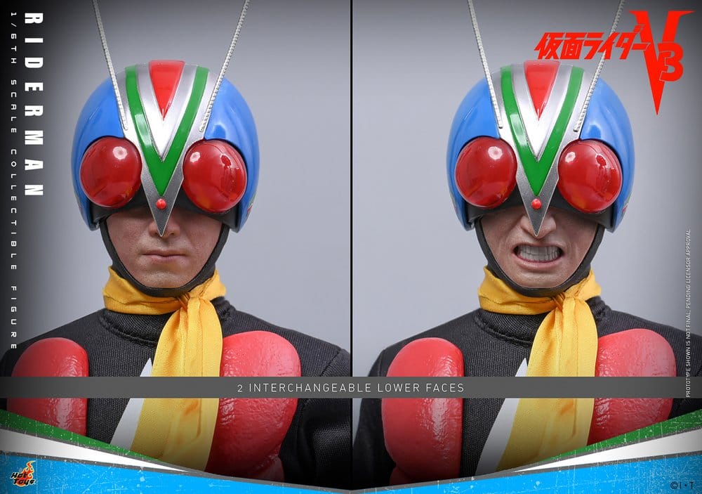 “Farewell, V3! I leave the rest up to you!” – Riderman A former elite scientist of the evil organization Destron, Joji Yuki was betrayed and lost his right arm, only to replace it with a cybernetic prosthetic and take up the mantle of Riderman! Starting as a rival driven by revenge and known as “The Avenging Demon”, he eventually fought alongside Kamen Rider V3 as a hero of justice, rightfully earning the legendary title of “Kamen Rider 4”. With his iconic half-exposed face and versatile “Cassette Arms”, Riderman remains one of the most unique heroes of the Showa era. Sideshow and Hot Toys is thrilled to expand the Kamen Rider collection and introduce the Riderman Sixth Scale Collectible Figure! Masterfully crafted based on the appearance of Riderman in the Kamen Rider V3 TV series, this action figure features a newly developed helmeted head with an authentic likeness of Takehisa Yamaguchi as Joji Yuki. The detailed helmet features a magnetic-activated LED light-up function in the eyes and comes with two interchangeable lower faces to capture his different expressions. Riderman’s costume features a black protective suit with green-and-white printed stripes, paired with red chest armor and silver-colored sleeves and boots made of soft vinyl material. A wire-embedded yellow muffler is also included to allow for dramatic, wind-blown posing. Riderman wouldn't be complete without his signature weaponry, featuring three sets of interchangeable Cassette Arms: the devastating Power Arm, the Drill Arm, and the highly versatile Rope Arm. The Rope Arm includes a wire-embedded extension rope and multiple attachments (Hook, Sickle, and Maces), allowing fans to seamlessly recreate his Hook Arm, Sickle Arm, and Swing Arm combat modes! To further enhance display potential, the figure also comes with various interchangeable hands, including a special handshake gesture to recreate his iconic bond with the 1/6th scale Kamen Rider V3 Collectible Figure. Complete your Showa Rider display and honor the legacy of Joji Yuki by adding this 1/6th scale Riderman figure to your collection today!