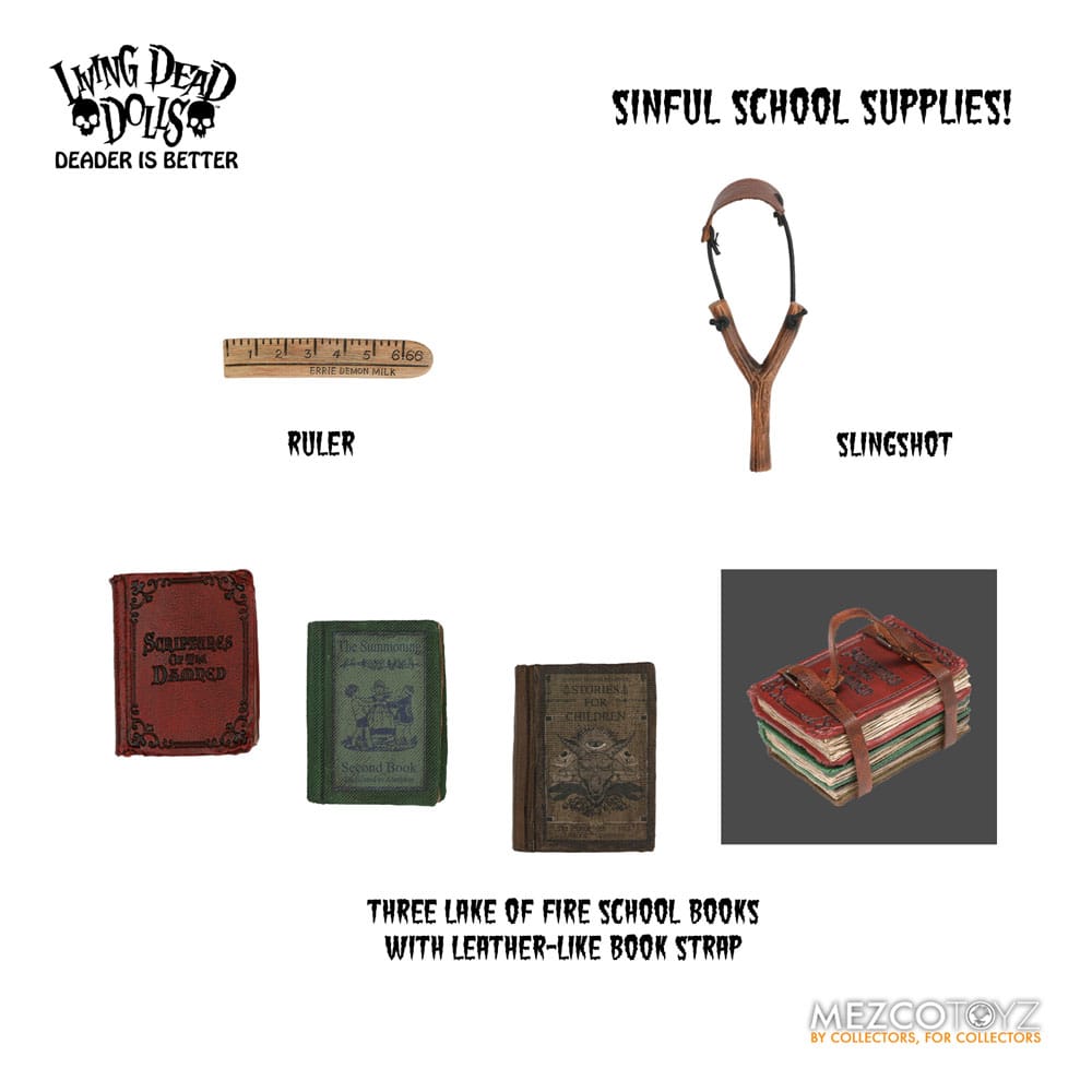 "And then there was Damien with a soul as empty as his eyes, This wee little lad pronounced D.O.A., was already dead inside."Dead, damned, and defiant, Damien rises once again from his casket with the return of Living Dead Dolls-newer, top-tier, and deader than ever!The mischievous schoolboy is possessed by two interchangeable "Death Mask" face plates, two interchangeable hairstyles, and two sets of glass-like eyes that switch from empty eyeballs to a soul-piercing stare. Damien wears his signature schoolboy uniform, including a removable overcoat, a blazer, a white shirt with a striped tie, shorts, socks, and a pair of worn boots, complete with a cap and a crown hat.With 18 points of articulation and 5 interchangeable hands, Damien offers a variety of posing options for enhanced interactivity. He comes complete with a slingshot featuring an elastic band and leather pouch, a ruler, and a stack of three books tied by leather straps.Damien is packaged in a coffin-shaped box.THE LIVING DEAD DOLLS - DAMIEN FEATURES:Doll: - Approximately 10" tall- Eighteen (18) points of articulation- Two (2) interchangeable, expressive "Death Masks"- Two (2) interchangeable hairstyles- Two (2) sets of glass-like eyes- Five (5) interchangeable handsOutfit:- One (1) schoolboy uniform blazer (removable)- One (1) white shirt- One (1) striped tie- One (1) schoolboy uniform shorts- One (1) pair of socks- One (1) pair of worn boots- One (1) overcoat (removable)- One (1) cap (removable)- One (1) crown hat (removable)Accessories:- One (1) slingshot with elastic band and leather pouch- One (1) ruler- Three (3) books with leather straps
