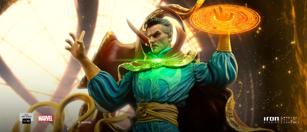 The Sorcerer Supreme joins the Avengers to face the Mad villain from Titan!With his vast mastery of the mystical arts, Earth's Sorcerer Supreme manipulates energies beyond human comprehension, supported by his protectors, the trinity of entities known as the Vishanti, composed of Agamotto, Hoggoth, and Oshtur. The fearless wizard floats with the powers of his enchanted cloak calledthe Cloak of Levitation, above ruins and jagged rocks, fragments of an insane temple created in tribute to the entity of Death by his mad admirer from Titan. With a stern countenance and incisive eyes, wearing the powerful artifact called the Eye of Agamotto on his chest, Iron Studios presents the classic version of themaster of mystical arts from Marvel universe in the statue "Dr. Strange Deluxe - Thanos x Avengers Comics - BDS Art Scale 1/10", inspired by the comics in which Earth's mightiest heroes face the threat of the mad Titan named Thanos and his Infinity Gauntlet. The statue comes with an extra interchangeable pair of handswith magic effects.Iron Studios will also bring the regular version of the statue "Dr. Strange - Thanos x Avengers Comics - BDS Art Scale 1/10", featuring the Sorcerer Supreme on a smaller battlefield base and without the interchangeable pair of hands with mystical effects.Doctor Strange is the Sorcerer Supreme in the Marvel Universe, created in the comics by Stan Lee and Steve Ditko in 1963. Stephen Strange was a brilliant neurosurgeon, but his arrogant, selfish, and greedy attitude made him socially isolated and unpopular among his peers. Strange then suffered a car accident that damaged the nerves in his hands, affecting his movements, stopping him from working as a surgeon. Too proud to accept lesser positions, he depleted his fortune in an attempt to cure himself, but without results. With his last resources, he went to the East in search of an old wizard called the Ancient One for treatment but ended up becoming his apprentice in the mystical arts. Strange became the Sorcerer Supreme on Earth, establishing his base in the Sanctum Sanctorum in Greenwich Village, New York, alongside his partner and friend Wong. When he began his superhero career, Doctor Strange initially remained distant from the superhero community, fighting his battles against Nightmare and Baron Mordo in secret. After a while, Loki manipulated Strange into attacking his brother Thor, but soon he turned against the god of mischief. Later, disguised as Dr. Donald Blake, Thor saved Strange's life by operating on him after another battle with Mordo. Shortly after, a confrontation with Mordo led Strange to ally with the young Spider-Man, who helped Strange rescue several people from a mystical dimension. The experience was so traumatic that Spider-Man asked Strange to remove his memories of the event, although this also made them forget Spider-Man's acts of heroism. Impressed by the bravery and altruism of the young hero, Strange came to consider him a friend, and the two joined forces many times. Strange and the Avengers were involved in the fight with Thanos of Titan wielding the Infinity Gauntlet. A worshiper of Death, Thanos used the powerful Infinity Gems on his gauntlet to eradicate half of the universe's population before the heroes defeated him and used the same power to undo the damage.Revealed in May on the Inside Iron Studios Day, check out the other previously revealed statues Thanos Deluxe, Thor, Captain America, and Nova, part of the same diorama. With its Pre-Order available, check out many other legendary Marvel Comics characters soon in new Iron Studios statues for this collection.Size: 38 cm