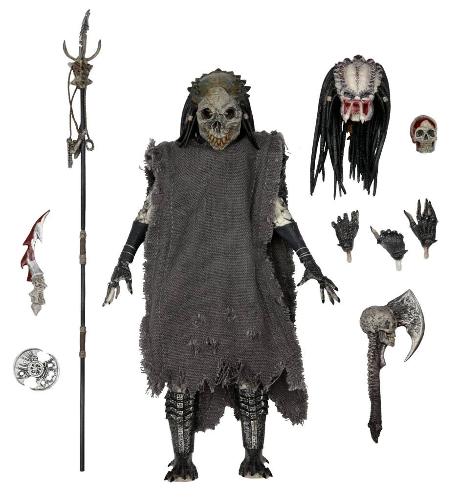 A long-awaited addition to NECA's Ultimate Predator line!After he defeats the City Hunter in Predator 2, detective Mike Harrigan encounters more members of the Lost Tribe, including a mysterious Predator who carries a distinctive staff. Includes cloak, staff, bone necklace, ritual dagger, open throwing disc, human skull, hatcheted skull, masked and unmasked heads, plus interchangeable hands. Collector-friendly window box packaging with opening front flap.