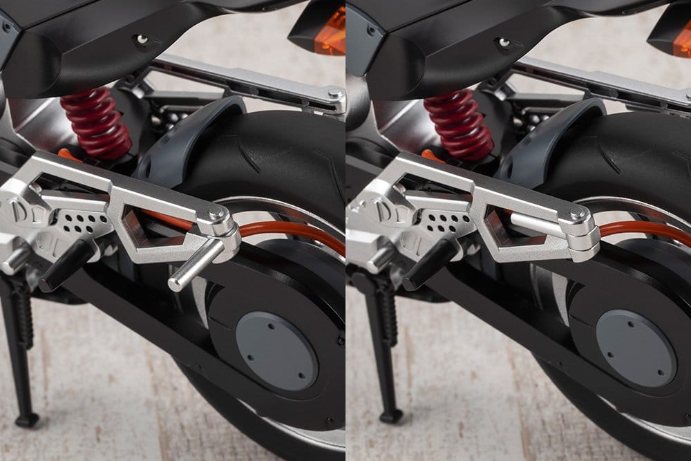 A highly versatile black color that can be used in any scene! A color variant of the Extreme Sports Bike joins the Kotobukiya exclusive lineup. A first for Kotobukiya’s original bike lineup, this is a standard, non-combat motorcycle. However, thanks to designer F, who also designs Megalomaria and M.S.G, it pairs exceptionally well with various series. At 1/10 scale, the total length is approximately 195mm. Sized to be ridden by character models with a total height of about 160mm, impactful scenes can be created by combining it with kits such as Maria Kagaribi [Dress Code] or Emulator from the Megalomaria series. Enjoy this snap-fit bike kit that is just as easy to assemble and enjoy as character model kits! *Rui Saotome?Touou High School Tracksuit?Dreaming Style Midnight Onyx requires the use of the riding body to board the bike. Features: The handlebars and tires are linked, allowing the steering angle to be changed. The tires can also freely rotate, allowing for manual rotation. The tandem steps at the rear of the vehicle can be deployed. In addition, a 3mm connection point is located at the bottom of the vehicle’s body, allowing it to be displayed using the separately sold Flying Base. Full-Face Helmet: By pulling out the top part of the helmet and the internal base, separately sold Sousai Shoujo Teien face parts can be used. This allows the expression to be changed to various compatible characters, such as Rui Saotome. The visor can be opened and closed. It is molded in clear plastic so that the attached face part can be easily seen. The interior of the helmet was meticulously sculpted to match the bangs and nape of Rui. It is compatible with Megalomaria (female body type) face parts, allowing for various combinations. The skin tone at the neck uses Skin Color C, allowing the face parts of a wide range of characters to be attached. *Regarding helmet compatibility: Sousai Shojo Teien's Ao Gennai and Bukiko Kotobuki use unique standards so they are not compatible with the helmet. *The helmet is the same as that included with Rui Saotome?Touou High School Tracksuit?Dreaming Style Midnight Onyx. Gloves: Three types of gloved hand parts are included: Open, Closed, and Gripping Handlebars. These hand parts can be attached kits from the Sousai Shoujo Teien series and Megalomaria series. Coloring: Bike: Black 1, Black 2, Gray, Smoke Gray, Clear Turquoise Green, Clear Orange, Clear Red, Orange, Red, Silver Full-Face Helmet: Black, Clear Black, Skin Color C, Milk Tea (Hair Color) Gloves: Gray